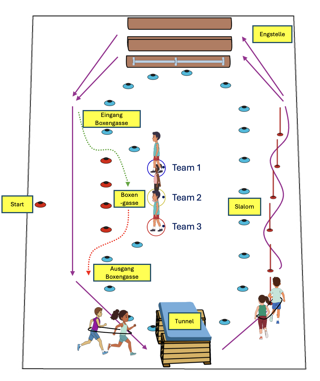 Der Parcours besteht aus einem Tunnel (2 Kästen mit Matte), Slalom-Teil und Engstelle (4 Langbänke). Besonders knifflig: Die laufenden Partner müssen während ihrer Runde miteinander verbunden bleiben, etwa mit einem zusammengeknoteten Springseil, einem Kastenteil, zwei Gymnastikstangen oder großen Ringen. Nur wer im Gleichklang läuft und sich gut abstimmt, kommt wirklich schnell voran.
