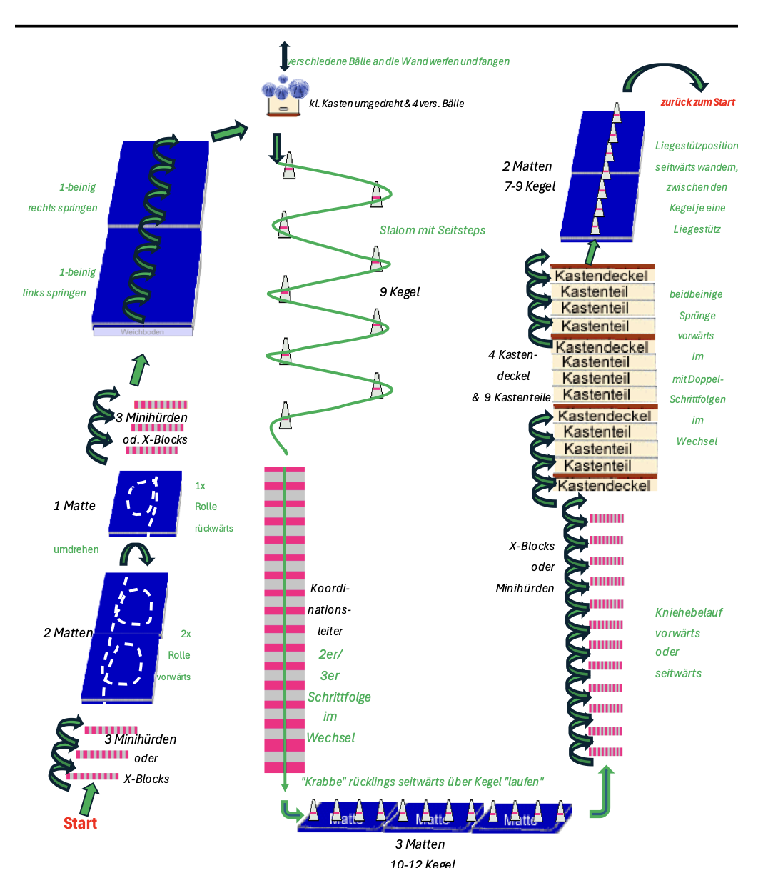 Der Parcours führt die Gruppe durch eine abwechslungsreiche Abfolge von Aufgaben, die Ausdauer, Stabilität, Rhythmus und Mut gleichermaßen fordern. Gestartet wird mit Minihürden, die übersprungen werden, gefolgt von zwei Rollen vorwärts. Danach geht es auf eine umgedrehte Langbank, die Balancegefühl verlangt, bevor eine Rückwärtsrolle ausgeführt wird. Anschließend balancieren die Teilnehmer über zwei Reckstangen und absolvieren einbeiniges Springen in weichen Matten. Eine Koordinationsleiter fordert die Schrittfolge „2 in – 2 out“.