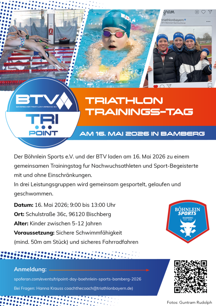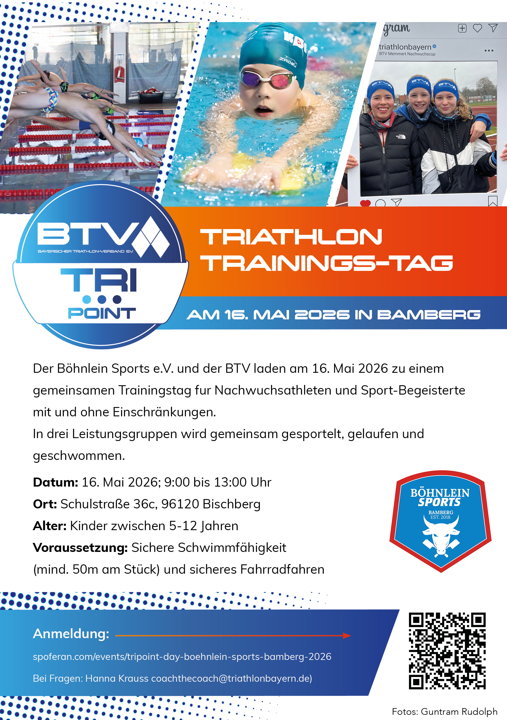 Oberfranken, TriPointDer Böhnlein Sports e.V. und der BTV laden am 16. Mai 2026 zu einem gemeinsamen Trainingstag für Nachwuchsathleten und Sport-Begeisterte mit und ohne Einschränkungen. In Bamberg wird in drei Leistungsgruppen gemeinsam gesportelt, gelaufen und geschwommen. Für alle Kinder, die gerne Schwimmen, Laufen und Fahrrad fahren. Wir werden gemeinsam Spiele spielen, rennen, Parcoursfahren und vieles mehr!
