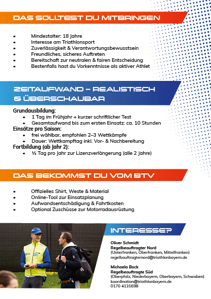 Nachrichten des BTVZwei offene Positionen bieten die Chance sich im Team des Bayerischen Triathlon-Verbandes einzubringen. Ab sofort sucht der BTV eine*n Mitarbeiter*in auf 450 Euro-Basis, die/der die zahlreichen laufenden Change-Prozesse im Verband begleitet. Daneben bietet der BTV engagierten Nachwuchssportler*innen die Chance im Rahmen einer Bundesfreiwilligenstelle von optimalen Trainingsbedingungen am Bundesstützpunkt Nürnberg zu profitieren.