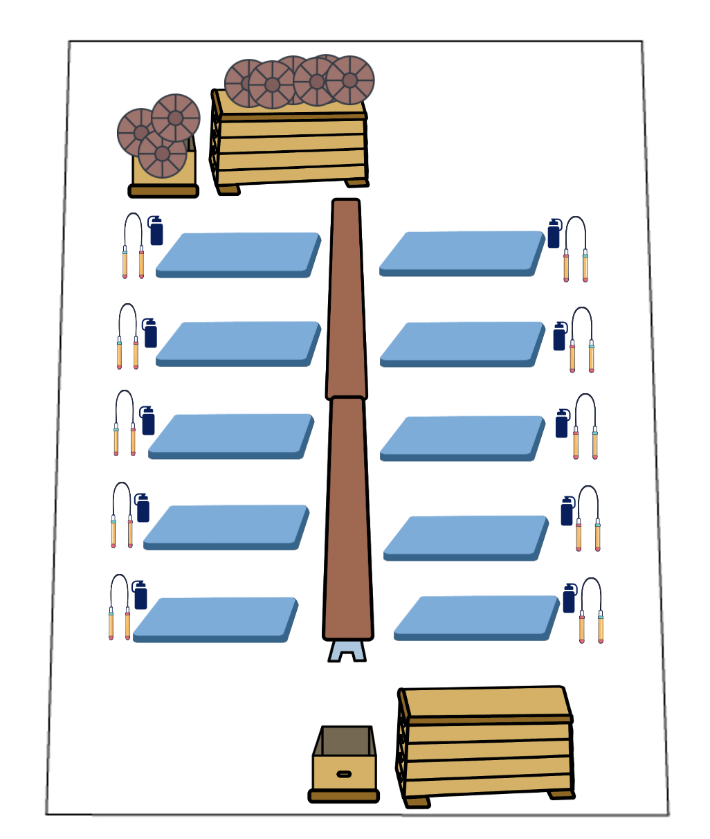 Jede Teilnehmerin und jeder Teilnehmer startet auf einer eigenen Matte, die als persönliche Trainingsstation dient. Dort werden verschiedene Kraft- und Stabilitätsübungen mit Zeitvorgaben ausgeführt, wobei die Langbank, kleine Gerätereize und Teaminteraktionen das Training abwechslungsreich und motivierend machen.