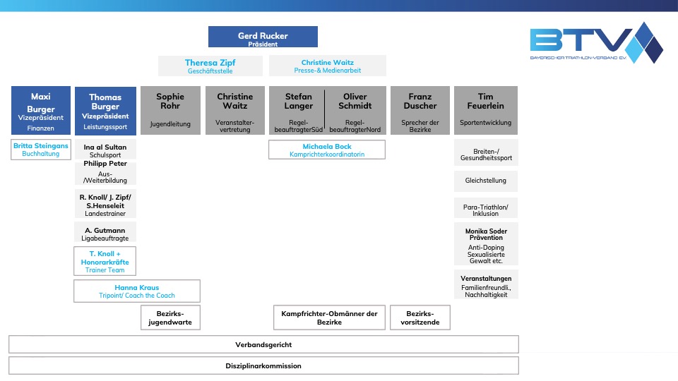 Der Bayerische Triathlon-Verband lebt von Menschen, die ihre Leidenschaft für den Sport in ehrenamtliche Verantwortung umsetzen. Präsidium und Verbandsrat geben die Richtung vor, hauptamtliche Mitarbeitende sichern die tägliche und professionelle Umsetzung, und spezialisierte Kommissionen sorgen für Transparenz und Qualität.